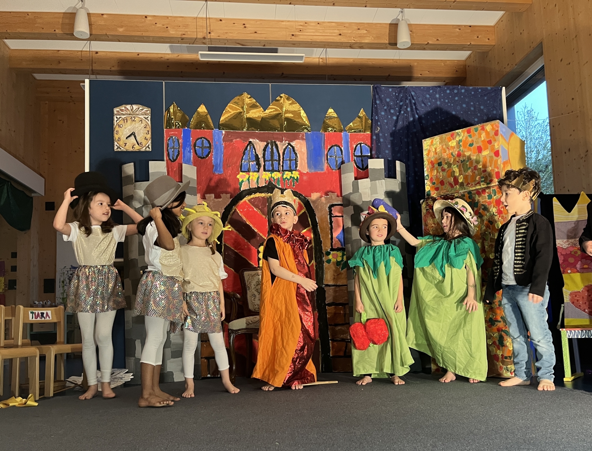 Der Kindergarten Salamander Grün hat sich in den letzten Wochen mit den Jahreszeiten und Monaten beschäftigt. In der Geschichte des Musicals ging es um einen König, welcher krank wurde, weil er die Zeit verloren hat. Die Kinder des kranken Königs suchten im Norden, Süden, Westen und Osten die vier Jahreszeiten und wollten damit ihrem Vater helfen. Mit viel Geschick, Mut und Rätsel lösen, gelang es ihnen, Hilfe bei den Jahreszeitenkönigen zu holen. So brachten sie ihrem kranken Vater von allen Monaten Geschenke wie Eiszapfen, Blumen, Sonnenstrahlen, reife Früchte. So wurde der König wieder gesund und alle freuten sich.