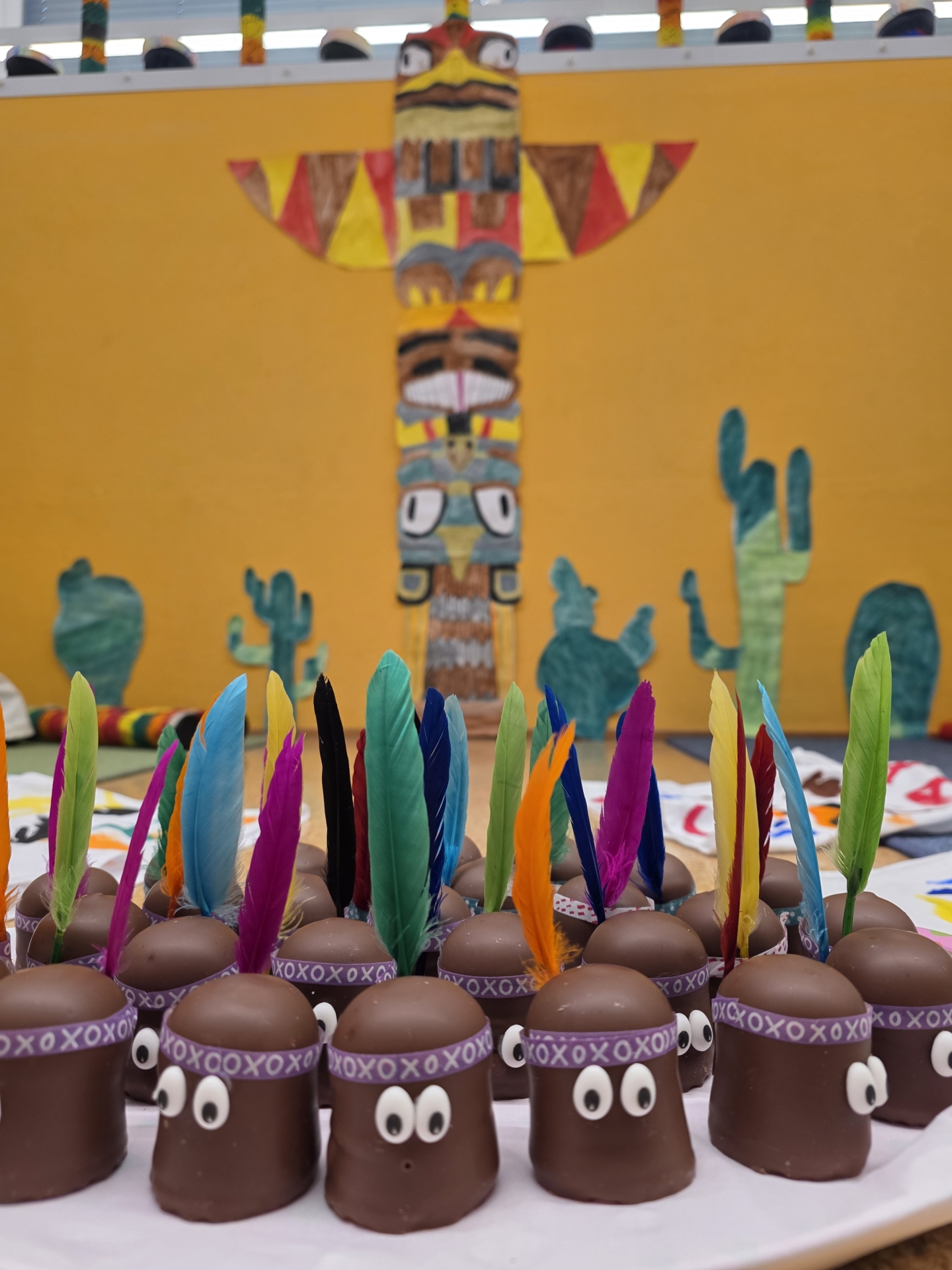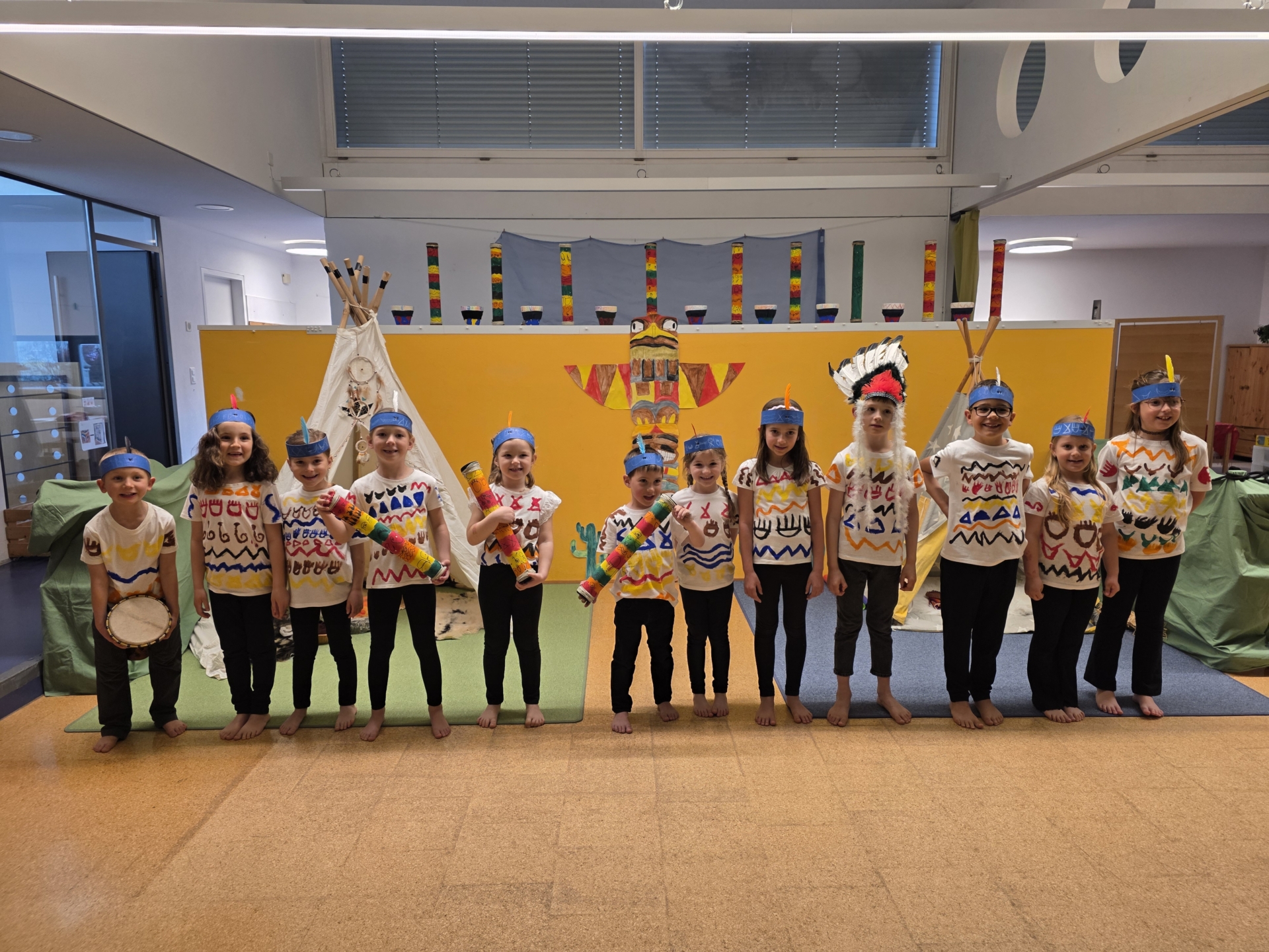 Wir, die Sioux-Indianer, haben über mehrere Wochen unser Musical geübt. Vor den Frühlingsferien war es endlich so weit. Wir hatten unseren grossen Auftritt vor Eltern, Geschwister, Grosseltern und Freunden. Der «Flinki Pfiil» bekam von seinem Vater, dem Häuptling, ein Pony «klina Stern» zum Geburtstag geschenkt. Doch in der Nacht wurde das Pony von den Cheyenne-Indianer gestohlen. Der «Flinki Pfiil» und seine zwei Freunde, das Wolfsohr und Adleraug, machten sich auf die Suche. Sie schlichen durch den Wald und entdecken ein Cheyenne-Indianermädchen «blaui Bluama». Sie hatte sich am Fuss verletzt und «Flinki Pfiil» half ihr. So kam es, dass die «blaui Bluama» am darauffolgenden Tag das Pony zum Tipidorf der Sioux zurückbrachte. Alle waren sehr froh, dass «klina Stern» wieder da war und es gab ein grosses Fest.